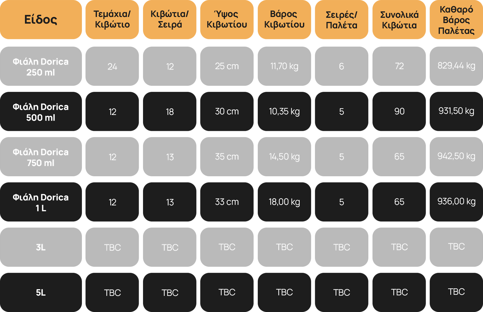 250 ml, 500 ml, 750 ml, 1 L, 3 L, 5 L